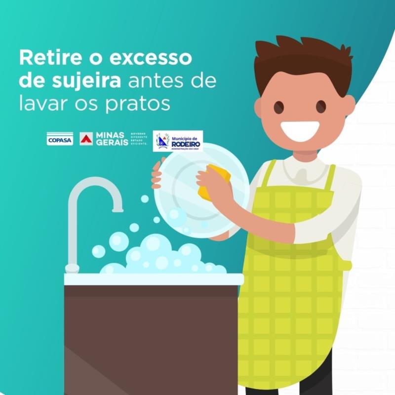 Na cozinha, também fechar a torneira enquanto ensaboa a louça e, antes de lavá-la, retirar ao máximo os restos de alimentos;