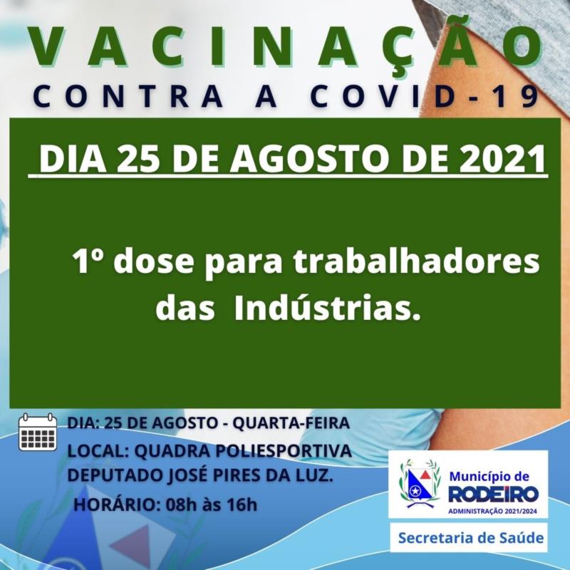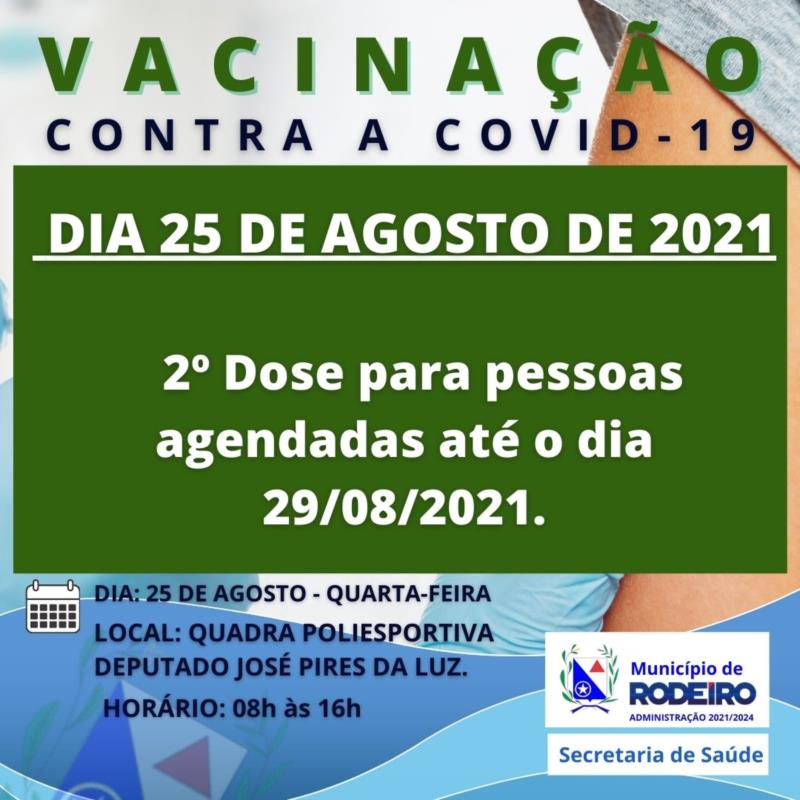 \r\n\r\nA Secretaria de Saúde de Rodeiro informa que a vacinação contra Covid -19 será realizada nesta quarta-feira 25 de agosto de 2021, na Quadra Poliesportiva Deputado José Pires da Luz, no horário de 08:00h às 16:00h para os seguintes grupos: