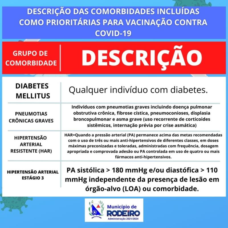 Aproveitamos para esclarecer que para os grupos prioritários será necessário a apresentação de atestado médico, além de ser obrigatório a apresentação do Cartão do SUS, Cartão de Vacina e acompanhamento dos pais ou responsáveis pela criança portando documentos pessoais.