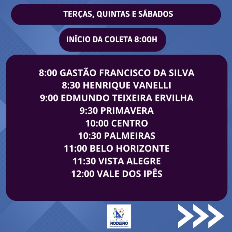 ATENÇÃO PARA O NOVO CRONOGRAMA DE COLETA DE LIXO RESIDENCIAL EM RODEIRO.