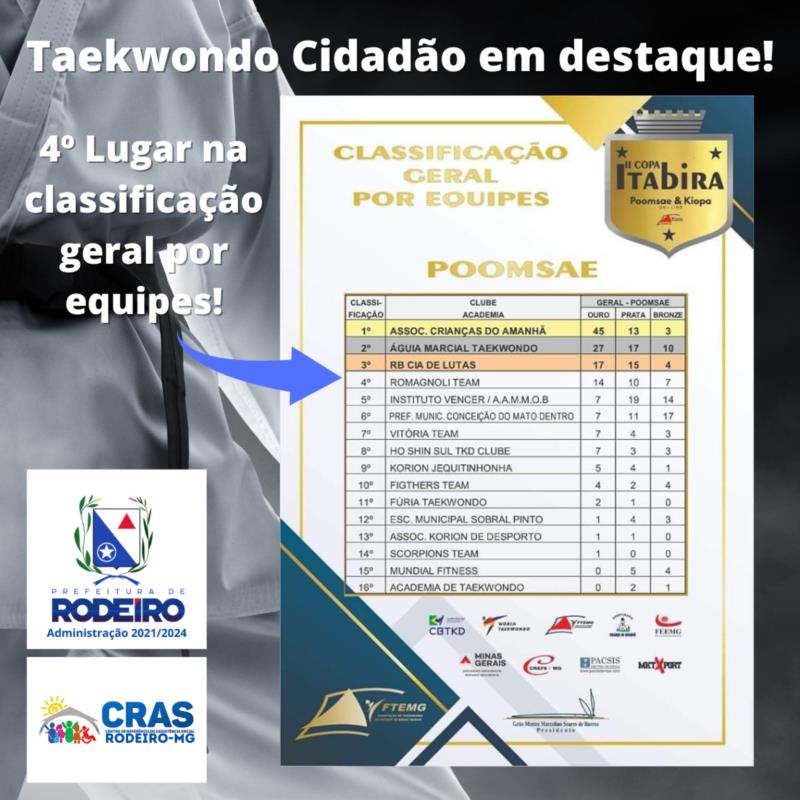 \r\nNos dias 15 e 16 de outubro de 2022, nossos atletas participaram da II COPA ITABIRA POOMSAE & KIOPA – ONLINE e graças ao trabalho brilhante do Professor Reinaldo Romagnoli, realizando no projeto social Taekwondo Cidadão/CRAS RODEIRO, nosso atletas chagaram a 4º colocação na classificação geral por equipes, o que é um grande feito para uma competição de tamanha relevância! Estamos orgulhosos pela dedicação de todos e esperamos que em breve tenhamos um lugar no pódio!